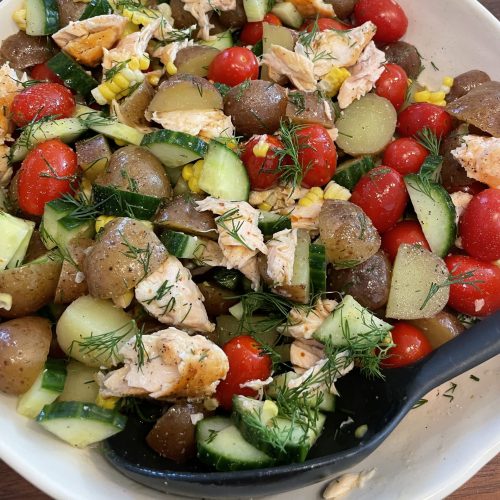 • In medium serving dish: Toss together salmon, corn (sliced off the cob), red potatoes, and cherry tomatoes.