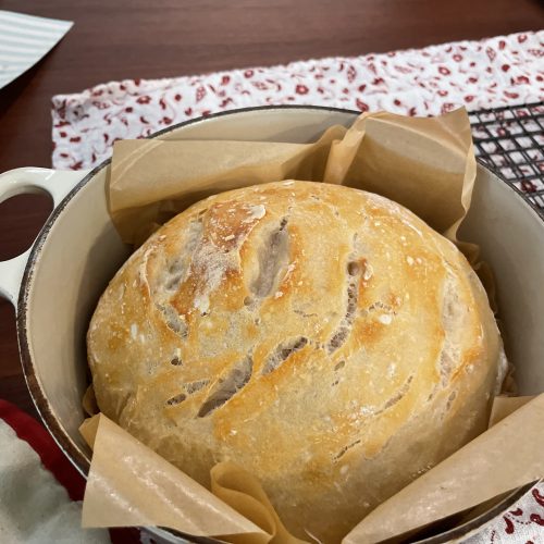 - Bake bread at 450℉ for 25 min covered; then 15 min uncovered.